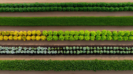 This aerial image showcases vibrant rows of vegetables in varied colors, highlighting the beauty of agriculture. The neatly arranged plants reflect a thriving farming landscape.