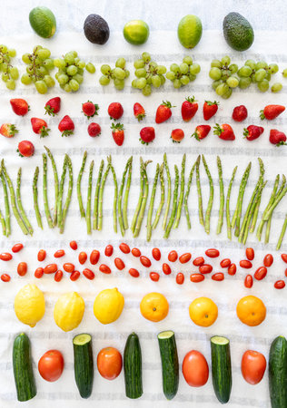Colorful collage of fruits and vegetables arranged by color for impactful food advertising