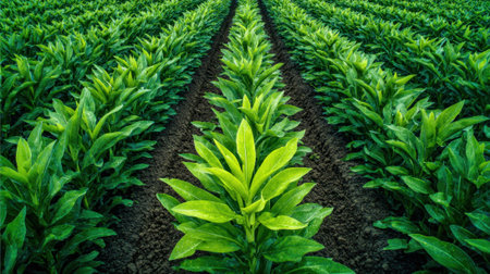 Lush leafy plants in dark soil rows. Aerial symmetry and vibrant contrast evoke clarity, rhythm, and editorial depth in agricultural and environmental storytelling.