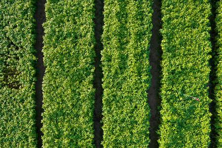 This aerial image showcases the vibrant rows of leafy vegetables in a well-maintained agricultural field. The healthy crops thrive in rich, dark soil, reflecting sustainable farming practices and a commitment to fresh produce.