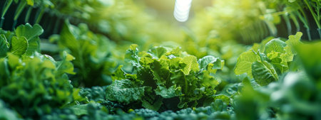 Close-up of lush green lettuce growing in an indoor garden, bathed in sunlight, highlighting the freshness and vitality of organic produce in a controlled environment.