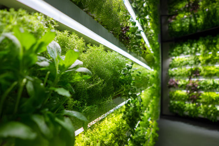 Vibrant hydroponic farm with vertical plant shelves under bright LED grow lights modern and sustainable agriculture concept