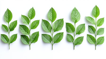 A stunning arrangement of various green leaves showcased on a white background, emphasizing the diversity and beauty of nature's foliage. Perfect for nature-themed projects.