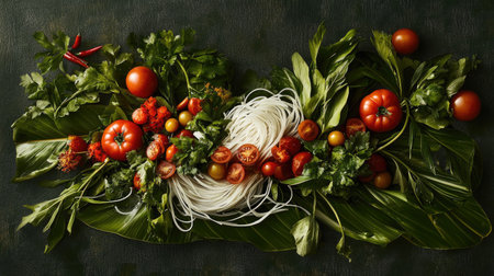 A vibrant flat lay of fresh tomatoes, greens, and noodles presented on a dark background, showcasing the beauty of healthy ingredients for culinary inspiration.