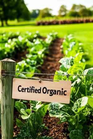 Lush greens thrive in a well-tended garden under a clear sky. A sign reading 'Certified Organic' highlights dedication to sustainable farming.