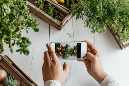 Farmer takes snapshot of vibrant vegetables with smartphone, showcasing fresh produce in rustic wooden crates. Bright, clean workspace inspired by agricultural practices.