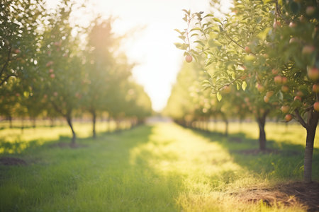 sunlit apple orchard rows