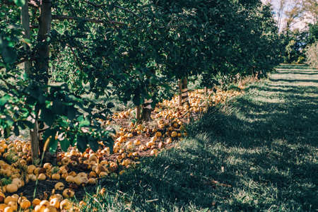 Ripe yellow apples on ground in orchard garden. Organic fallen dropped rotten fruits lying under apple trees on farm. Sunny summer autumn day in countryside. Eco natural background.