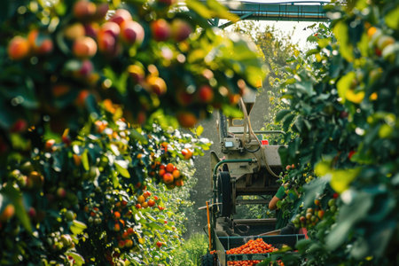 Orchard harvesting with advanced machinery and ripe apples in vibrant greenery