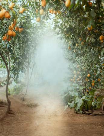 Mystical fairy abstract background of nature, fabulous fog smoke mist in orchard. Fantasy path, way, dirt road in citrus lemon trees, green leaves. No people. Art backdrop natural beautiful landscape.