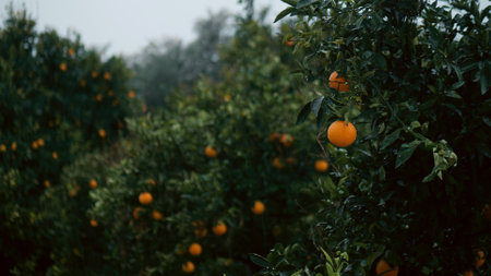 Serene view of a vibrant orange orchard, showcasing ripe fruit hanging from trees amidst a misty landscape. A peaceful pathway invites exploration.