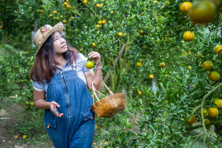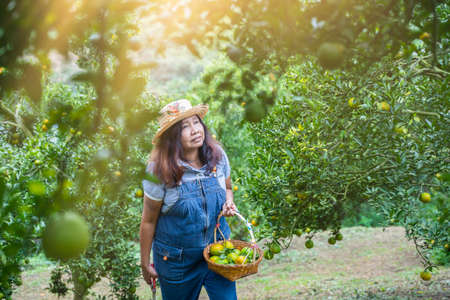 Asian middle age woman gardener picking organic orange in a orange orchard, harvesting ripe orange crop. Agriculture harvesting and plantation concept.