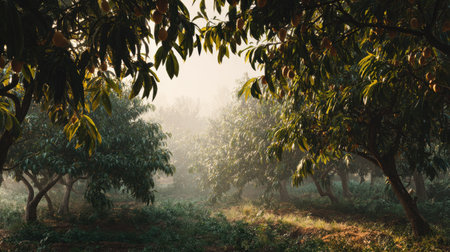 Vibrant green leaves surround a beautiful mango plantation where ripe golden mangoes dangle from tree branches, illuminated by soft, natural light.