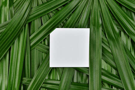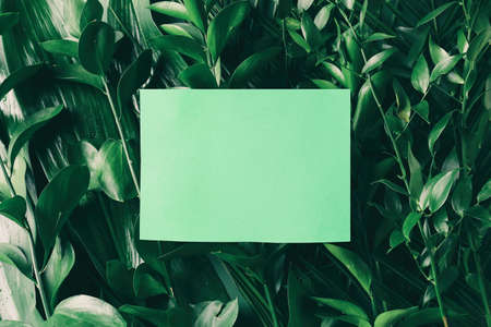 creative natural background of leaves with white blank card as copy space, creative summer design, jungle composition