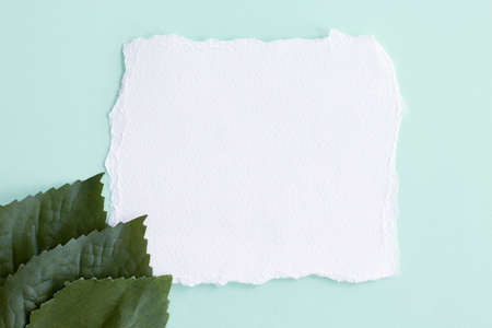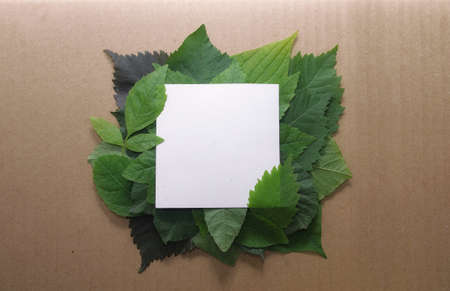 Green leaves with paper card note. Nature concept