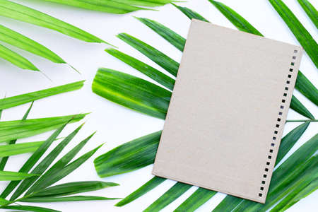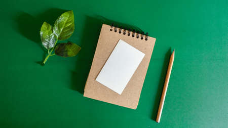 Kraft memo pad with green leaf on green background. top view, copy space