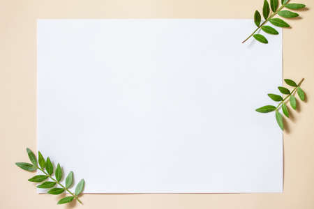 Blank brown paper with green leaves on white background.