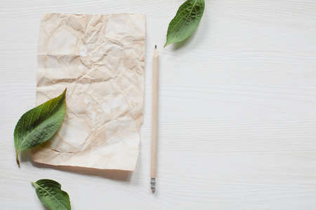 Rustic sheet of paper with pencil and leaves on white wooden table