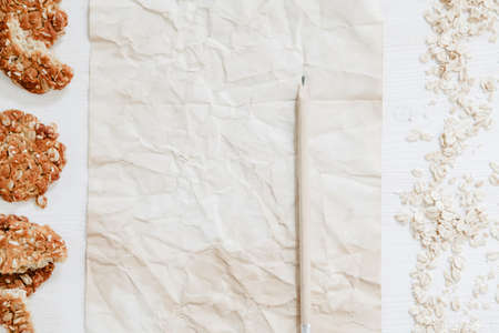White paper and pencil with decoration on the wooden desk, top view.