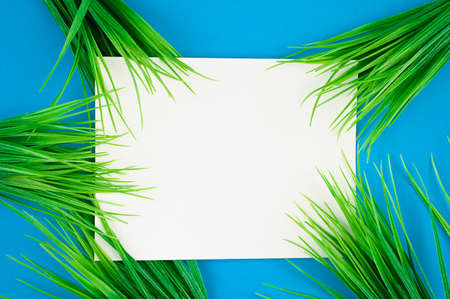 flat lay white leaf on blue background with green grass
