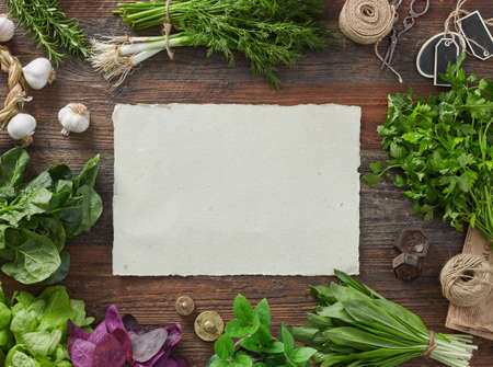 Blank greeting card, invitation with craft book note. Little green leaves and pencil green textured background. Flat lay, top view.
