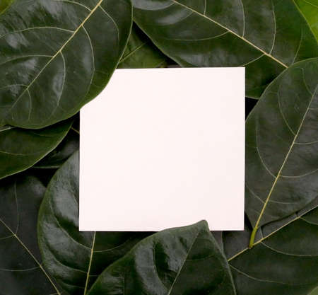 Square papper on the background of green leaves of tropical plants. Text frame. Concept of a postcard on the theme of nature and the environment