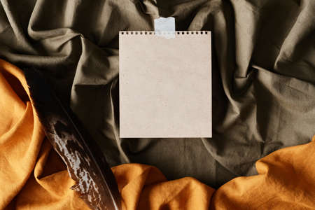Above view of blank sticky note and feather on wrinkled gray and orange fabrics