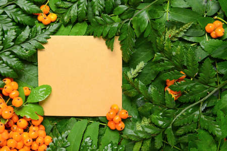 Blank card on plant branches and leaves
