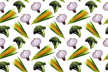 Seamless background with various vegetables on white. Colorful pattern.