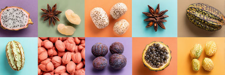 A grid of exotic fruits and spices showcasing vibrant colors and details in daylight.