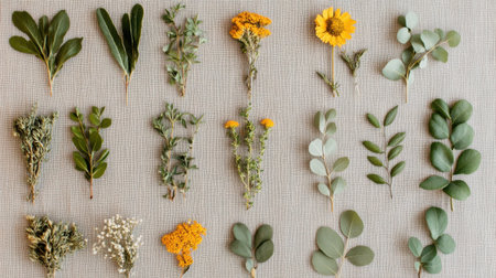 This image features a carefully arranged collection of fresh herbs and vibrant flowers displayed on a textured fabric background, perfect for creative projects.