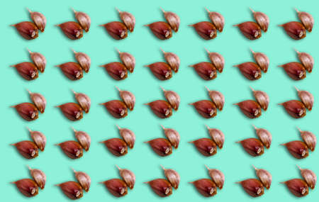 The whole unpeeled garlic head pattern isolated on white. A trendy hard light, dark shadow, flat lay, mockup, template