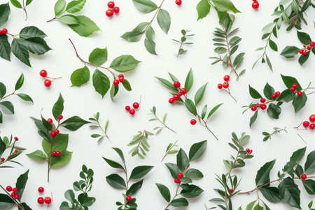 Festive Christmas decorations on white background with red, green accents.