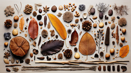 A vibrant assortment of natural elements including leaves, pine cones, and twigs arranged on a soft green background