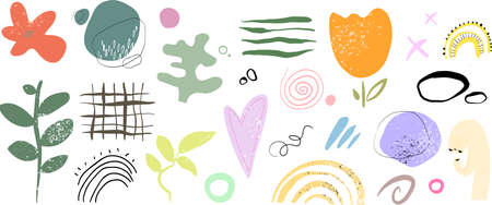 A large set of different faces, leaves, flowers, abstract shapes and backgrounds. Abstract shapes. Hand-drawn style. Elements for design and printing on fabric. Stock graphics.