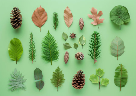Arrangement of various leaves and pine cones on a pastel green background, showcasing diverse textures and shapes. Nature and ecology concept.