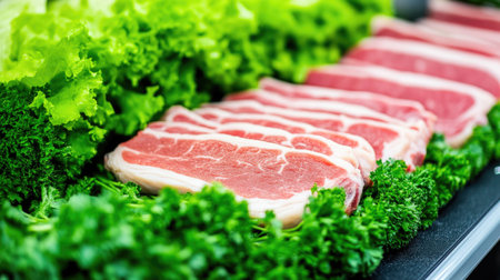 Raw kurobuta pork slices on plates for sukoyaki and yakiniku hot pot shabu japanese food