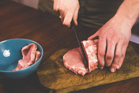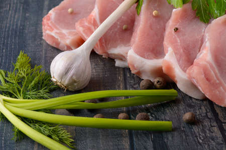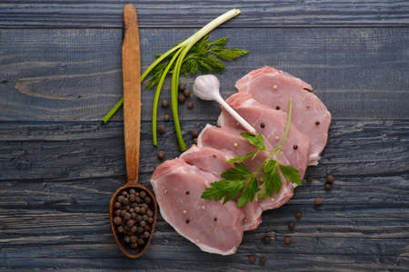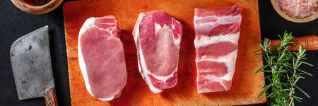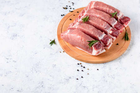 Raw pork meat chops on a wooden board. Top view. Preparation for cooking