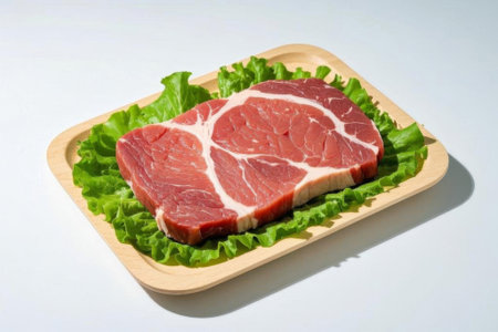 A piece of raw red meat with a lettuce leaf on a cutting board. Cooking steak at home