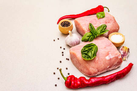 Raw pork meat loin with fresh vegetables and dry spice. Animal protein healthy cooking concept. Chili and black pepper, garlic, basil, sea salt. Light stone concrete background, copy space