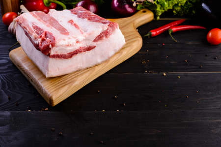 raw pork fat against black wooden background for copy space Big piece of fresh fat