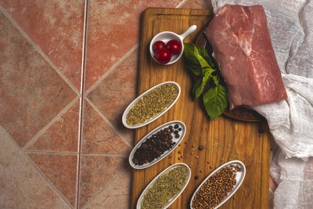 Raw meat on a cutting board. dark background. Preparation for cooking pork meat. Various spices, seasonings lie nearby.