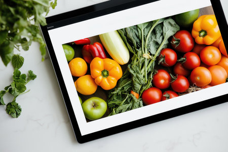 Hands holding tablet displaying online grocery store website, browsing fresh produce and meal options for convenient home delivery