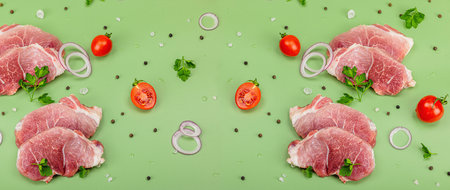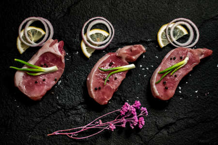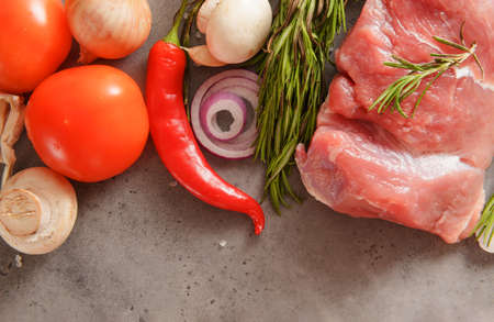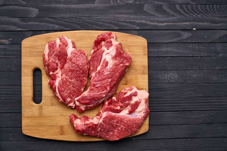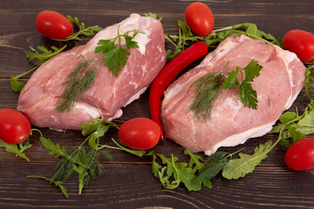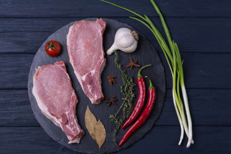 Raw pork. Fresh steak on the table top view.