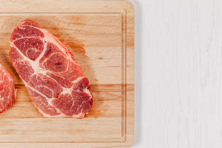 fresh raw marbled pork steak on a solid beech wood cutting board on a white table