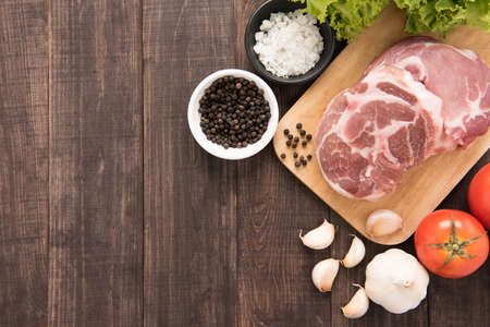 Top view raw pork steak and pepper on wooden background.