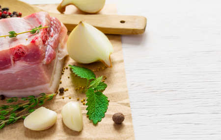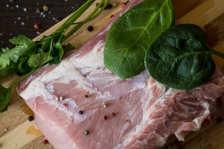 greens, seasonings and meat on a cutting board. a piece of pork, pepper, garlic, salt. Cook at home. fresh food