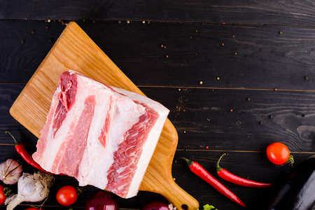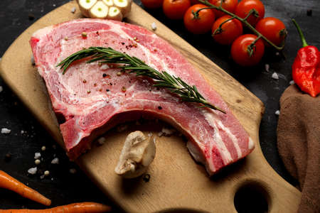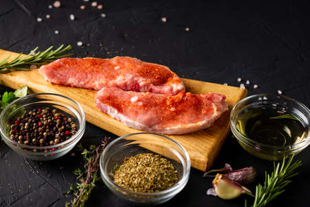Raw meat on a cutting board. dark background. Preparation for cooking pork meat. Various spices, seasonings lie nearby.