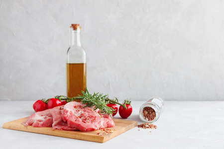 Raw meat, pork steaks with spices, herbs, olive oil, white marble background on cutting board, copy space