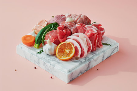 Meat vegetables and fruits on a marble tray